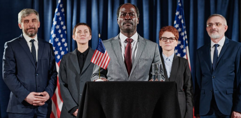 Black Male Politician and Associate Shaking Hands in front of Flashing Cameras